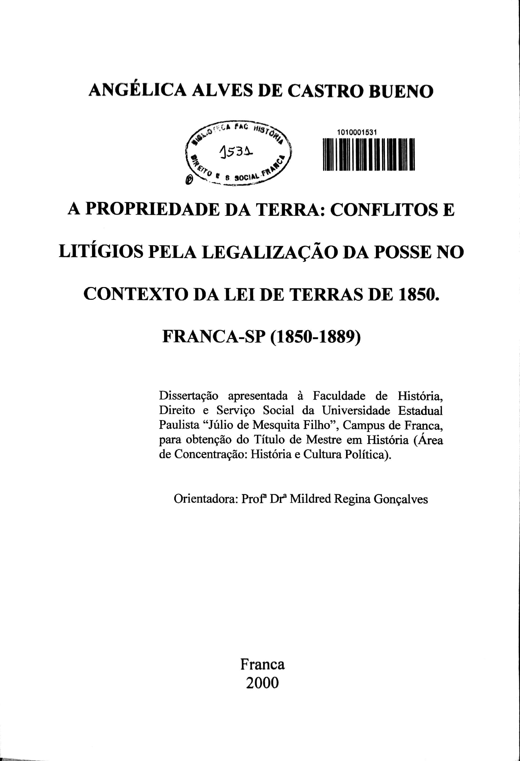 A Propriedade da Terra: Conflitos e Litígios pela Legalização da Posse no Contexto da Lei de Terras de 1850. Franca - SP (1850-1889)