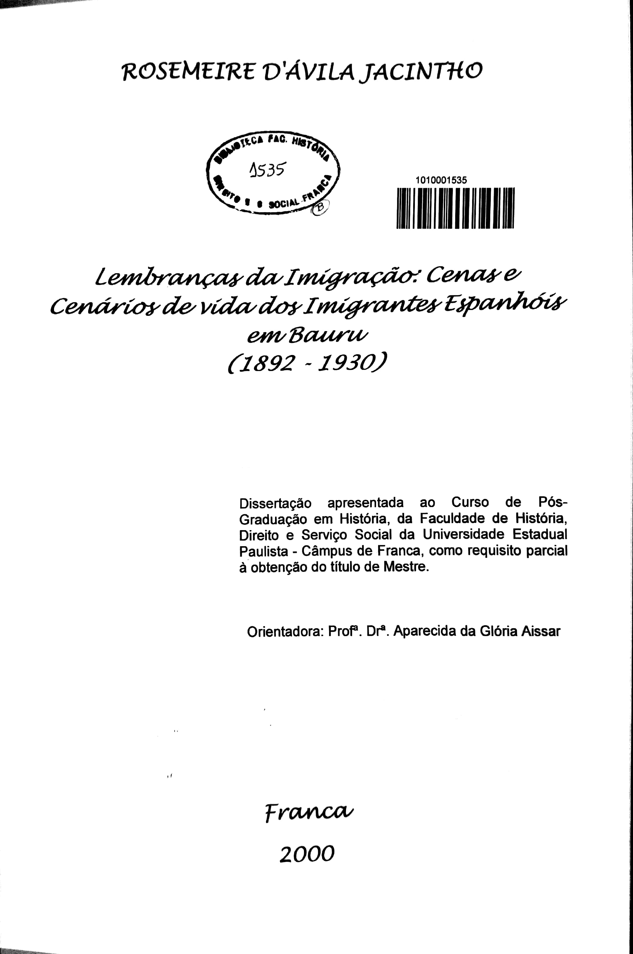 Lembranças da Imigração: Cenas e Cenários de Vida dos Imigrantes Espanhóis em Bauru (1892-1930)
