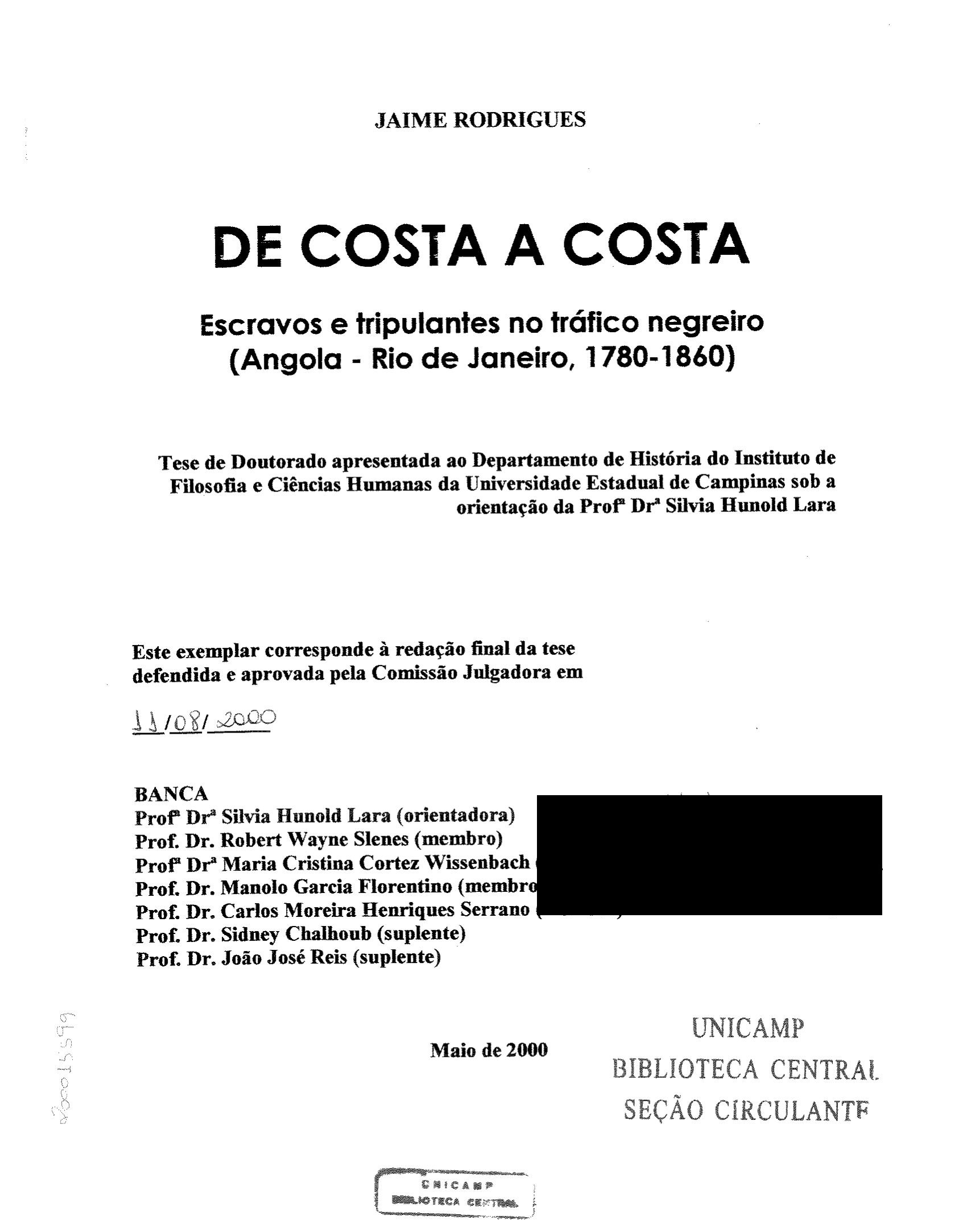 De Costa a Costa: Escravos e Tripulantes no Tráfico Negreiro (Angola-Rio de Janeiro, 1780-1860)