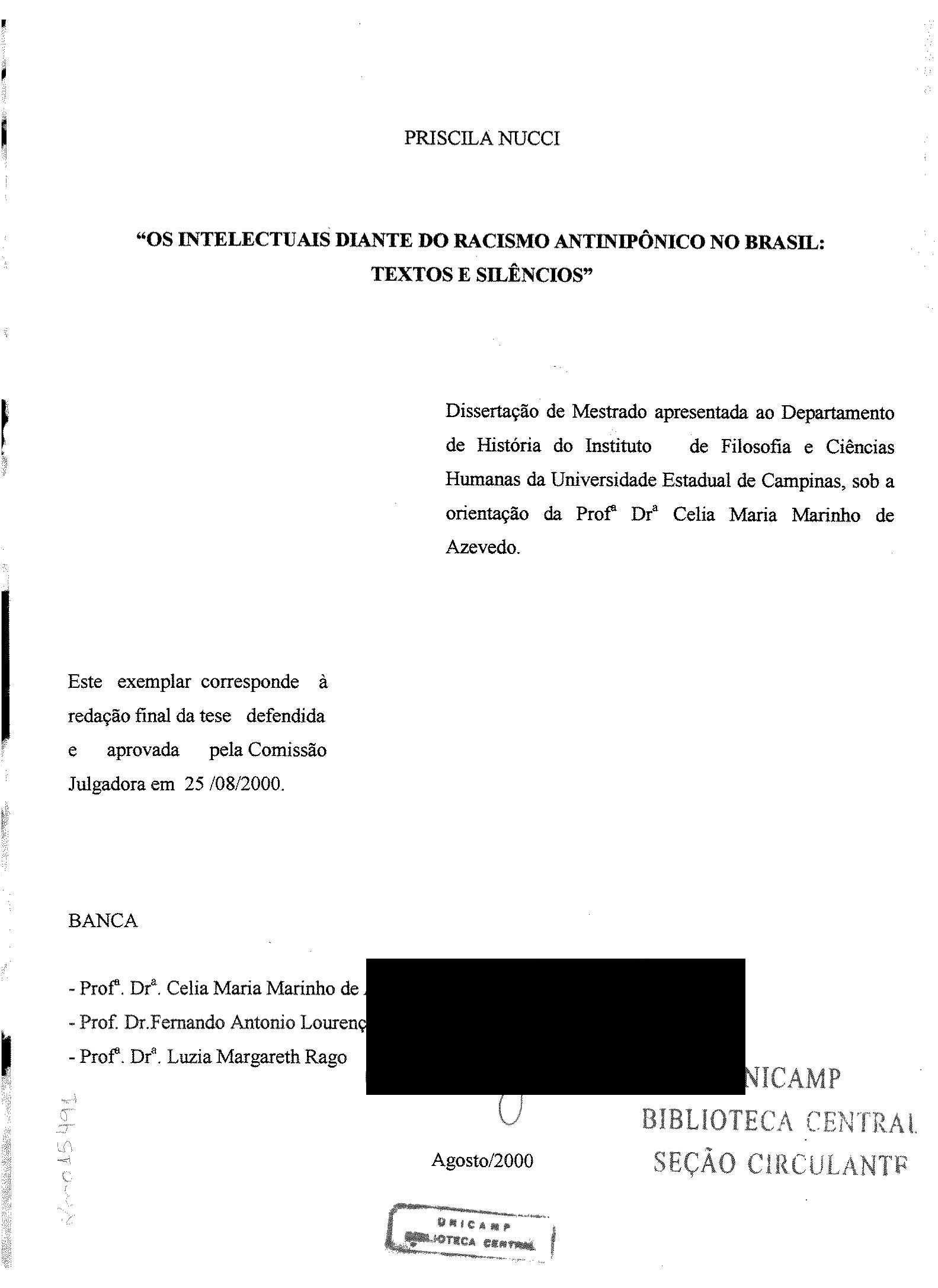 O objetivo desta pesquisa é o estudo da construção de uma história de silêncio sobre os discursos racistas contra os japoneses e seus descendentes na produção científica-intelectual que elegeu este contingente populacional como objeto de estudo no Brasil, nas décadas de 1940 a 1960. A pesquisa foi desenvolvida tendo em vista as elaborações feitas sobre os imigrantes japoneses em parte da década de 1930 e no contexto da II Guerra - períodos onde estas elaborações tomam matizes e encaminhamentos próprios -, e o quase vazio bibliográfico sobre o tema do racismo contra os asiáticos, e especificamente contra os japoneses, verificado posteriormente durante várias décadas no Brasil em estudos que acabam por se firmar como paradigmáticos. Procuramos demonstrar como as imagens e idéias sobre a imigração japonesa para o Brasil e sobre a "raça japonesa ou amarela" sofreram novas elaborações por parte dos estudiosos do assunto nas décadas de 1940 a 1960, de modo que o tema do racismo contra os japoneses no Brasil foi minimizado ou tomou-se quase inexistente nos discursos acadêmicos. Portanto, verificamos como se dá a passagem de um tipo de abordagem, ainda vigente na década de 1940, para outra que começa a tomar forma neste momento e se firma nas décadas seguintes de 1950-60, analisando as mudanças no discurso científico intelectual e resgatando as imagens e idéias sobre os japoneses no Brasil |