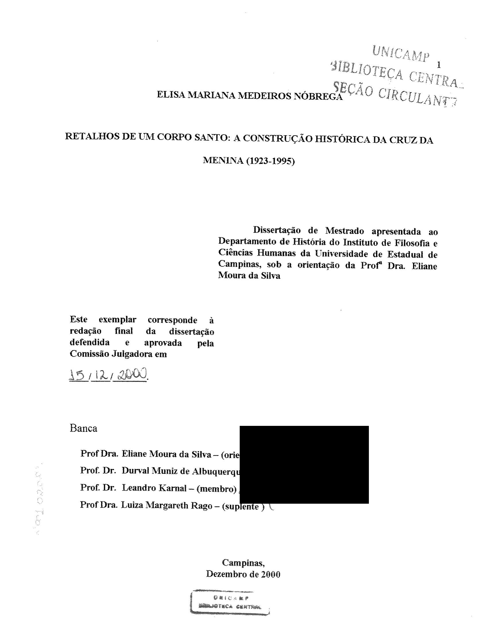 Este trabalho teve como objetivo estudar a invenção da tradição religiosa da Cruz da Menina na cidade de Patos, interior da Paraíba, no período de 1923 a 1995, problematizando como, a partir de um crime bárbaro de uma criança, se construiu historicamente um imaginário religioso que edificou e legitimou a menina Francisca como a Santa da Cruz da Menina. Percebendo como as "artes de fazer" são produzidas, apropriadas e pontuadas pelos discursos na elaboração e institucionalização da crença, a partir dos seguintes marcos elencados: a morte em 1923 da menina Francisca e a sua elaboração lingüística/documental a partir da abertura do inquérito policial; a construção da capela em 1929, abertura do processo-crime em 1932 e a construção de um parque turístico religioso em volta da capela em 1993, discutindo como esses marcos são acionados e ressignificados pela construção de uma memória social |