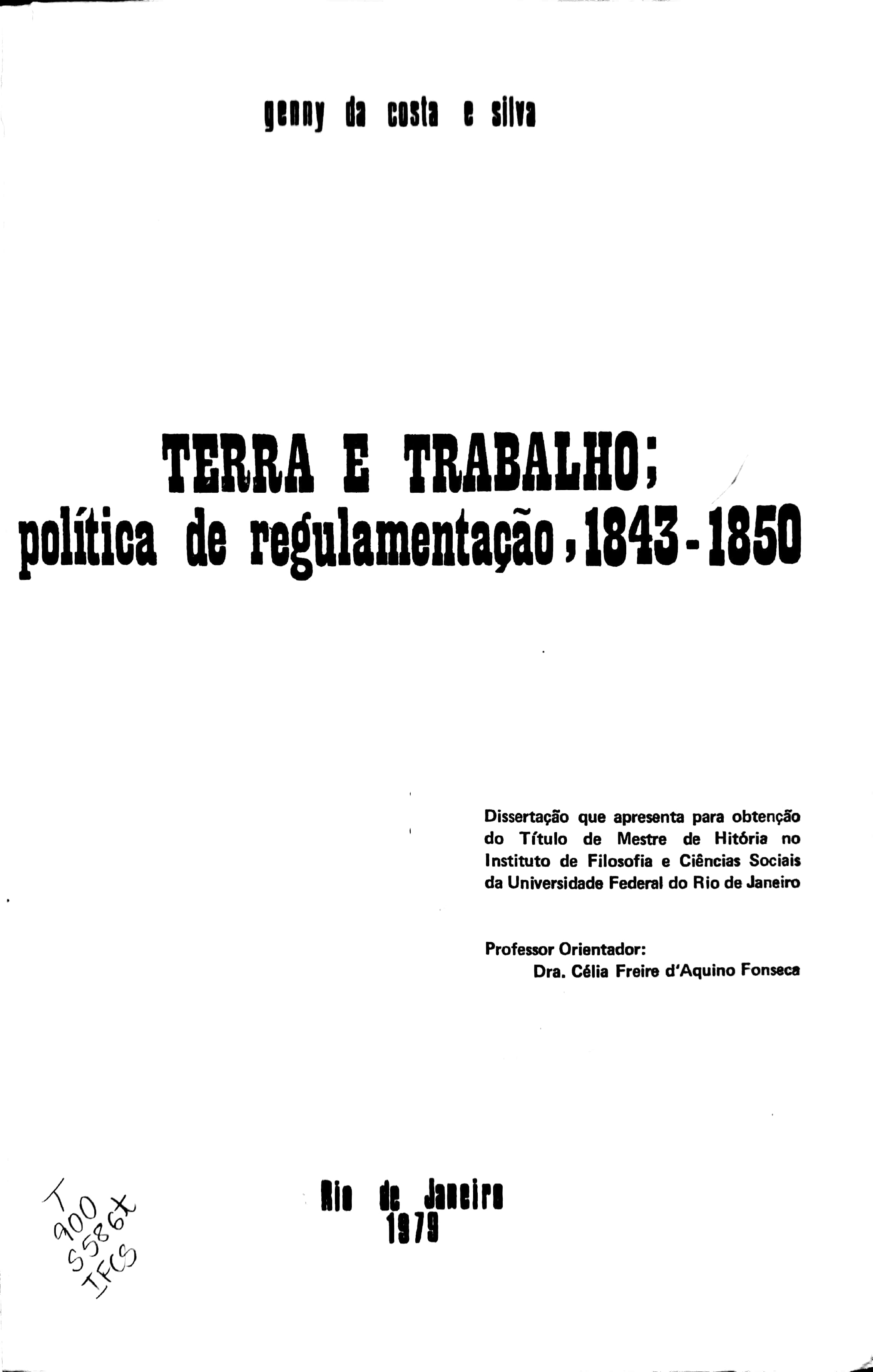 Apreciação da Quinta e da Oitava Legislaturas, 1843 e 1850, no que se refere às mudanças propostas para a distribuição de terras e substituição de braço escravo, num período de revisão desses problemas que afetavam o Império, exigindo soluções decisivas e rápidas. Apresentação dos debates parlamentares sobre a política de terra e trabalho, seus argumentos e mecanismos de defesa visando manter o sistema de produção estabelecido, bem como o embate de forças novas contra a resistência conservadora. A realidade brasileira da época com seus conflitos e contradições vista criticamente, pelos deputados. Aprovação da Lei de Terras n. 601, de 18/09/1850, que firma a legalização da grande propriedade, estabelecendo a vinda de terras devolutas como recurso para financiar a colonização de estrangeiros, objetivando a introdução de trabalho livre, numa sociedade escravocrata. |