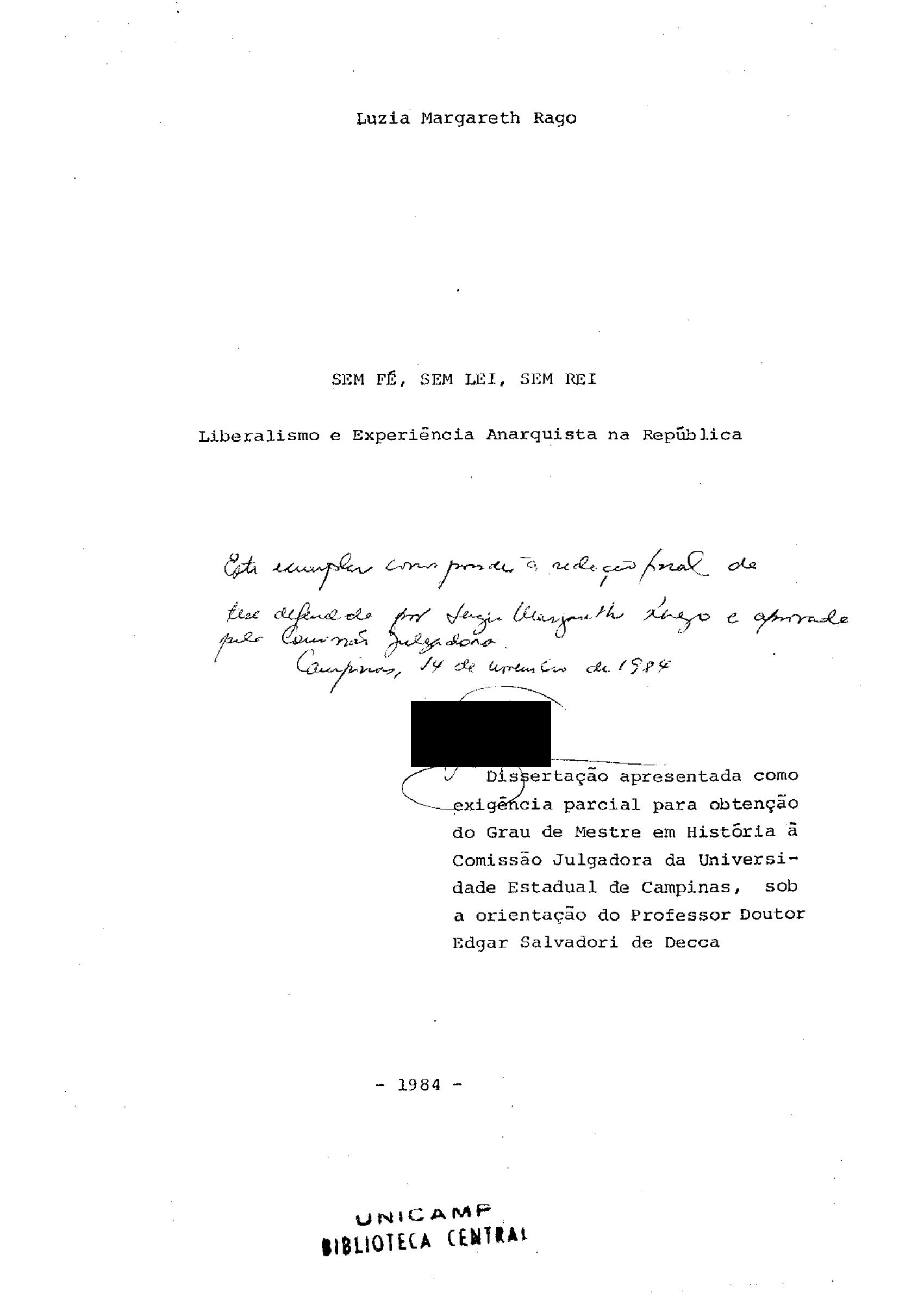 Luzia Margareth Rago (Orientador: Edgar Salvadori de Decca)