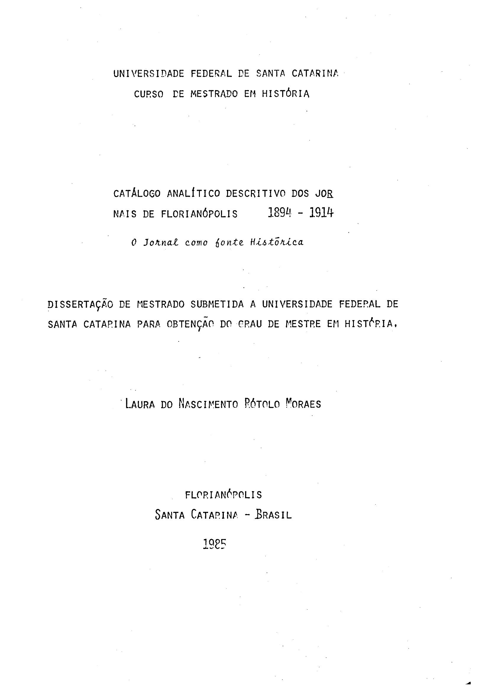 O presente trabalho procura evidenciar a importância do jornal florianopolitano como fonte histórica, enquadrando-o em seu panorama internacional, nacional, regional e capitalino. Compreende portanto, um levantamento dos periódicos existentes no lapso de 1894-1914 em Florianópolis, localizados na Biblioteca Pública da cidade, somando um total de quarenta e seis títulos. Levanta fichas catalográficas analíticas visando facilitar a tarefa de futuros pesquisadores. Ressalta aspectos como: titulação dos jornais, objetivos e epígrafes, circunstâncias publicitárias, as características tipográficas e redacionais onde destaca: o formato, a tiragem, o número de páginas e colunas. Bem como, os folhetins literários registrando a presença de vários escritores de projeção regional, nacional e até mesmo internacional, os suplementos, as transcrições, os vários tipos de notícias e anúncios comerciais. Destaca ainda as personagens demonstrando homens que se projetaram na imprensa e na sociedade local; o preço dos periódicos e as suas características hemerográficas. Inserem-se algumas fotografias de ilustrações interessantes. Apóia-se o conjunto em quadros, índices de lâminas e onomástico, para facilitar consultas. |