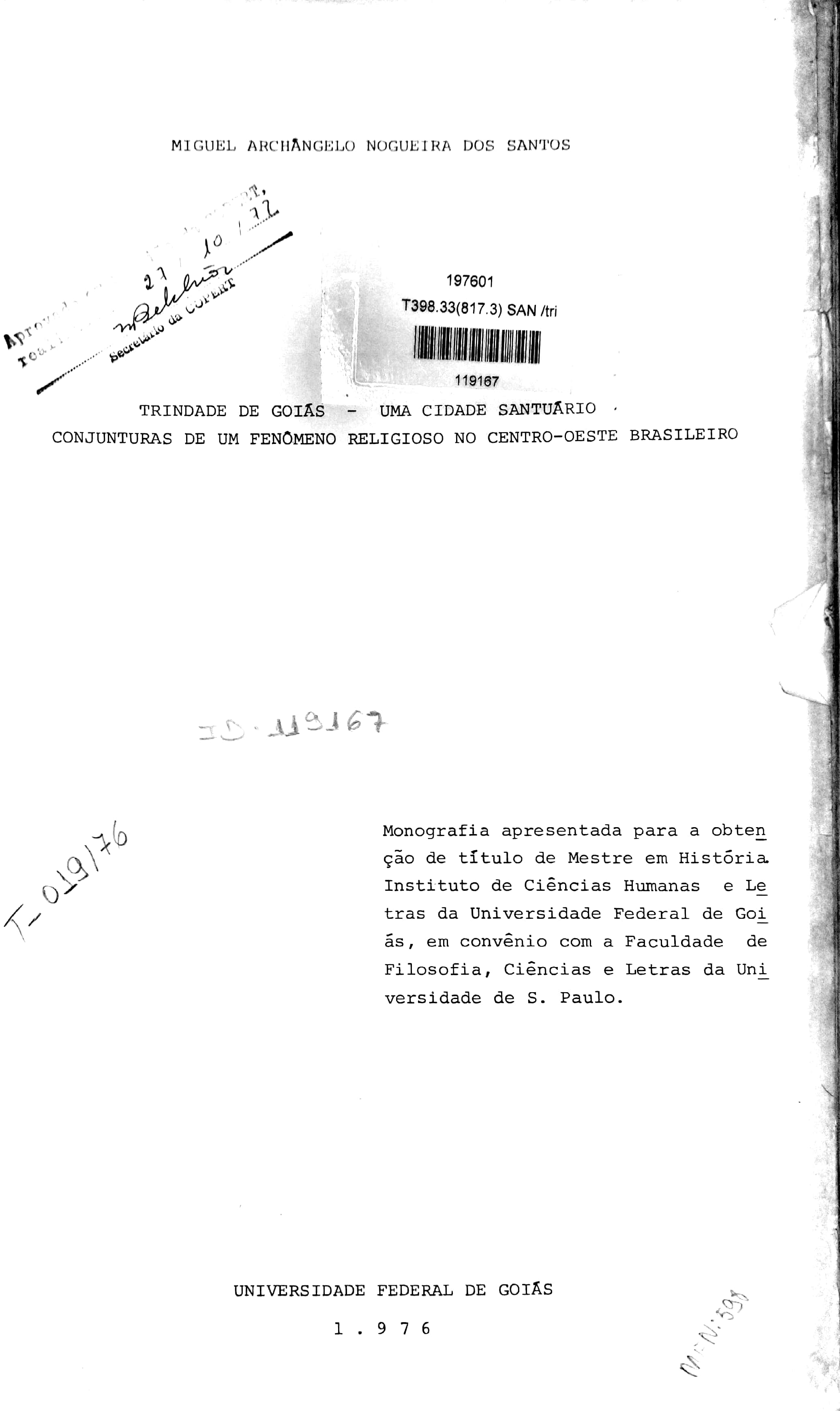 O trabalho, sobre a devoção e a romaria do Divino Padre Eterno, representa um esforço a mais de pesquisa sobre o fenômeno religioso, visando precipuamente o Centro-Oeste Brasileiro. Embora com objetivos acentuadamente históricos, o trabalho incursiona também por outros setores, como o sociológico, o antropológico, o geográfico e memo o psicológico, uma vez que, sem eles não seria possível atingir os objetivos principais. Este estudo visa analisar a origem da Devoção ao Divino Padre Eterno no ambiente goiano, em especial, dando ênfase aos seus condicionamentos e ao seu significado, inclusive para o desenvolvimento regional e local, ou seja, do Município de Trindade; procura, por outro lado, analisar as razões e as dimensões do desenvolvimento da romaria, bem como seus aspectos mais importantes. O tema é, pois, especificamente religioso sob o gênero histórico e pretende dar também sua contribuição ao conhecimento da História de Goiás. |